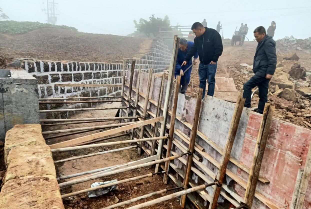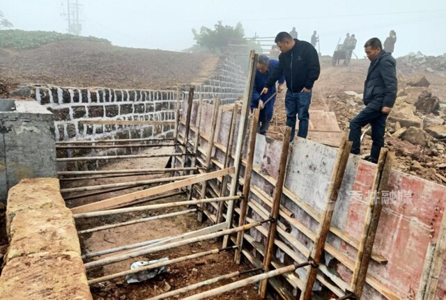 在艾叶镇毛狗湾水库溢洪道整治工程正在紧张推进,区水务部门的工作人员正在现场检查工程进展情况。工程即将进入到坝顶、坝基和流水面的全面加固整治阶段,将在明年三月全面完工。