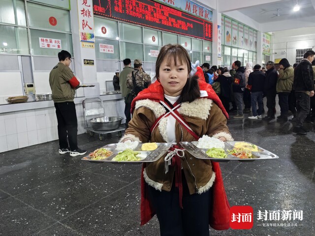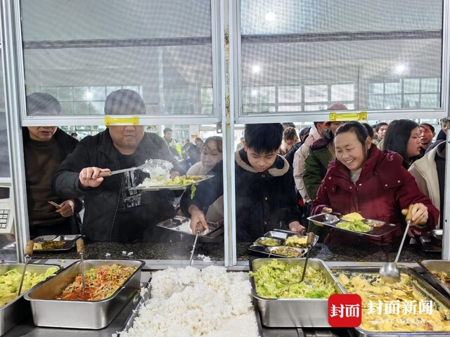 2月9日一早,宜宾市筠连县第二中学校安置点,被转移安置的群众正在吃早餐。食堂阿姨一边盛面条,一边对大家伙说:“不够吃来加,要吃饱。”