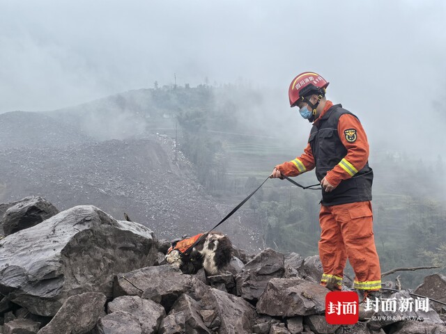 滑坡体上,消防救援人员利用搜救犬、生命探测仪从下至上对垮塌废墟和滑坡体进行搜索,对关键点位进行标注,然后对废墟现场进行浅表搜救。测绘人员则运用专业设备对地形持续勘测着。