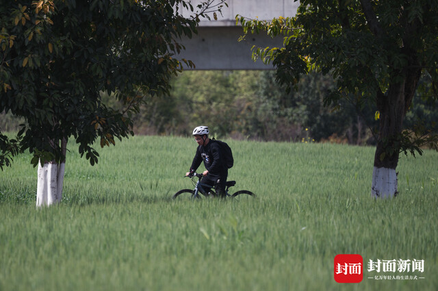成都地铁2号线大面铺站附近,游客在麦田边骑行。