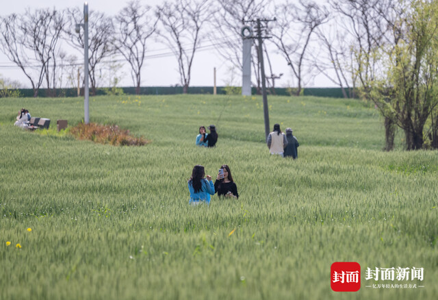 成都地铁2号线大面铺站附近,游客在麦田边拍照打卡。