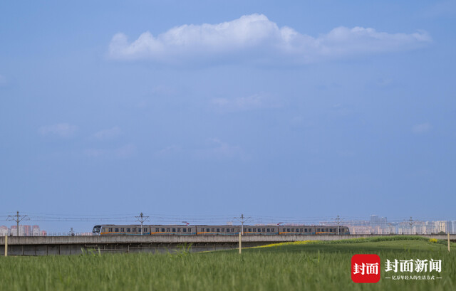 成都地铁2号线大面铺站附近,蓝天白云下,地铁从麦田边穿过。
