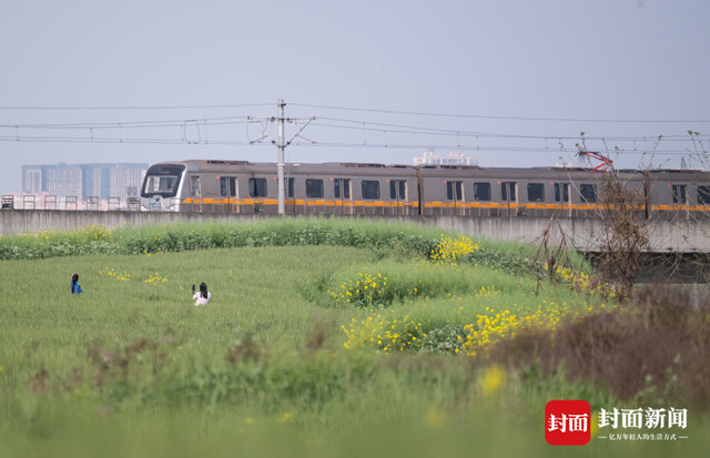 成都地铁2号线大面铺站附近,游客拍摄地铁和麦田同框。