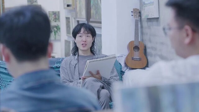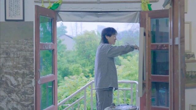 一栋农家小楼的二层,李明正坐在画架前,眼睛盯着画布上一幅还未完成的植物画。四周灰色墙壁挂满了画作,地上散落着陶罐、颜料与木吉他。