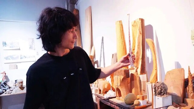 李明进门时,南希正在破椅子里酣睡。这位甘肃汉子来新都十多年,开口已是地道的四川话。李明恶作剧地拍醒他,两人沿着未抹灰的水泥楼梯走上二层木雕工作室,地面满是作品。最显眼的光头半身木雕,一支长丫枝缀着粉蝶拖垂至地——南希笑称这个作品名为“异想天开”。
