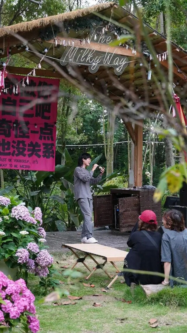 六一儿童节后的第二天,下着小雨,李明在村中的“月涧星河”营地发起音乐派对。他在台上唱起黑豹乐队的《Don't break my heart》,台下,丁大娘和几位村民还有几位画家朋友在零星的雨点中拍照、鼓掌。