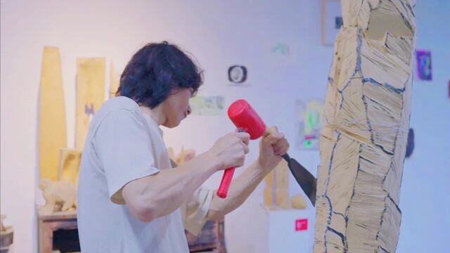 南希在河塘边捡的一株木头,扛回家凿成艺术装置